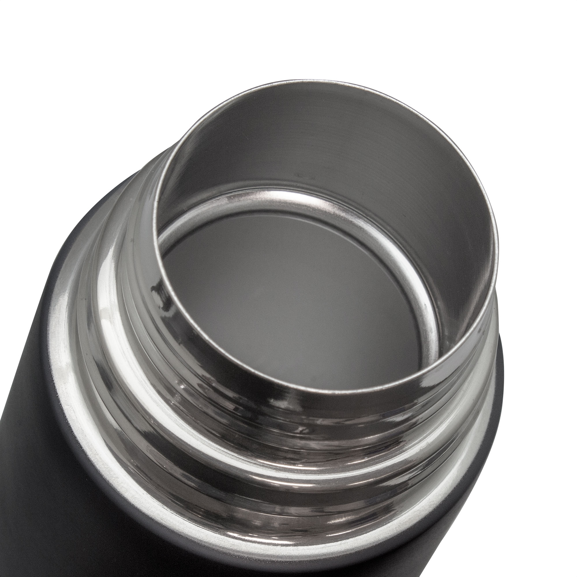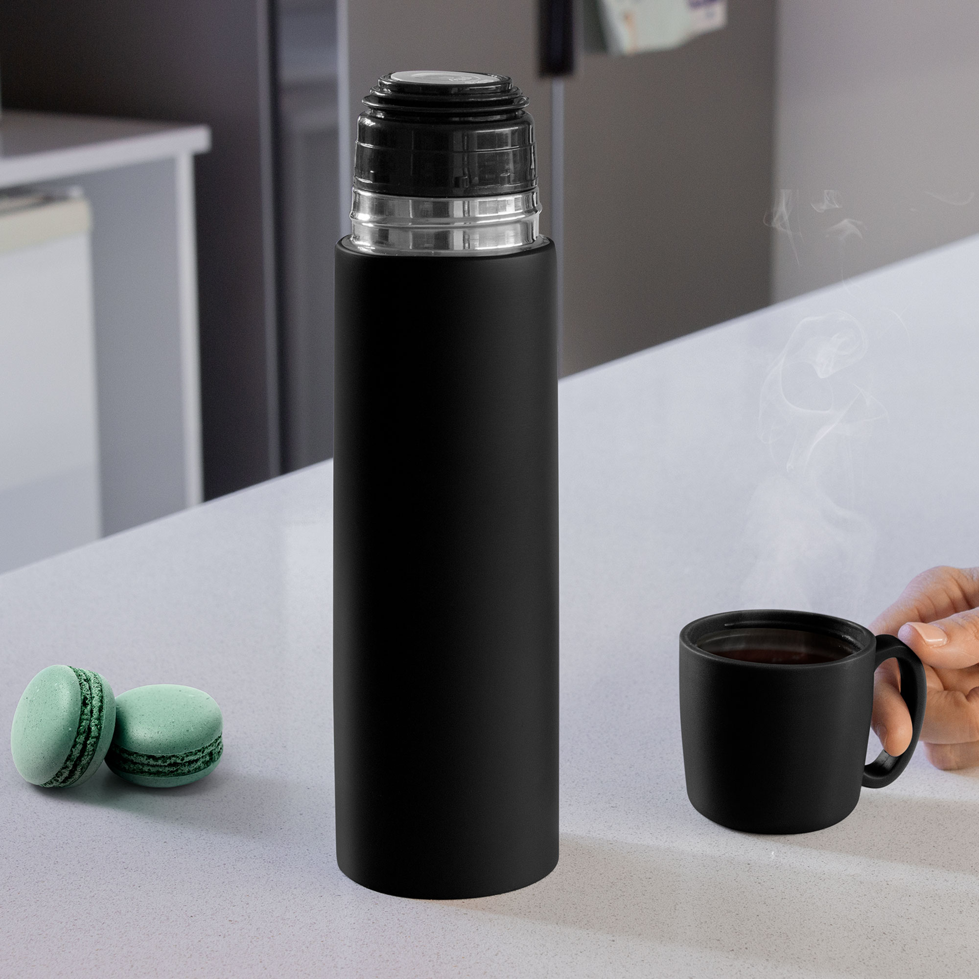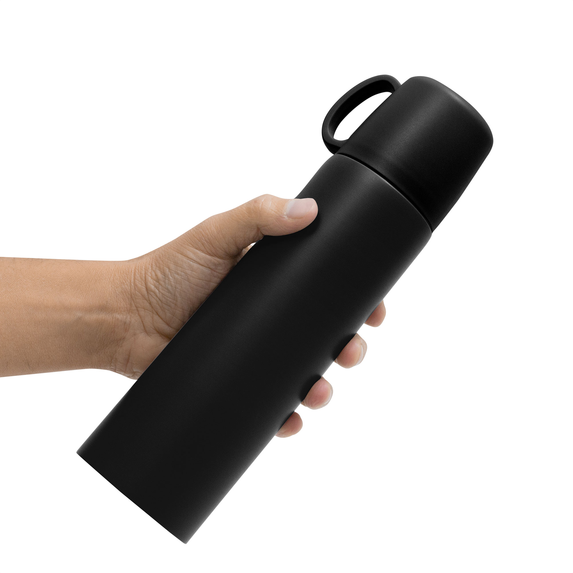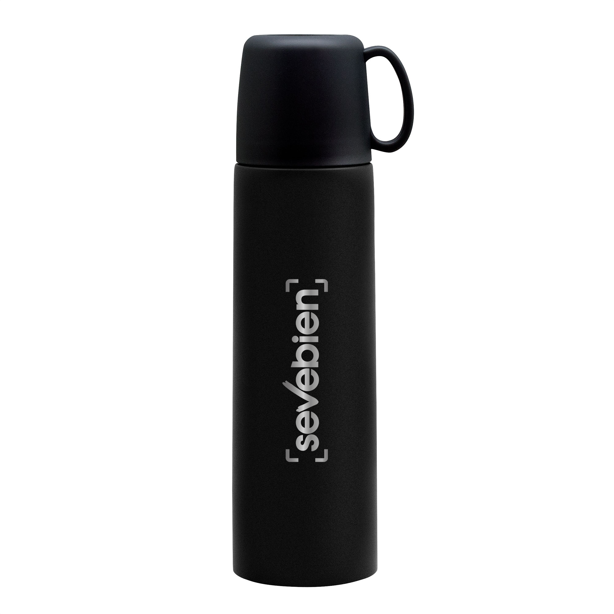 8,1 x 6,8 x 25 cm. Capacidad 500 ml. Acero inoxidable y Polipropileno. Termo con aislamiento térmico vacuum. Acero inoxidable 304 interior / 201 exterior. Tapa y taza plásticas en color negro. Pintura acabado mate. Mantiene hasta 12 hs la temperatura de las bebidas calientes y 24 hs de las bebidas frías. Presentación en caja de regalo Kraft.