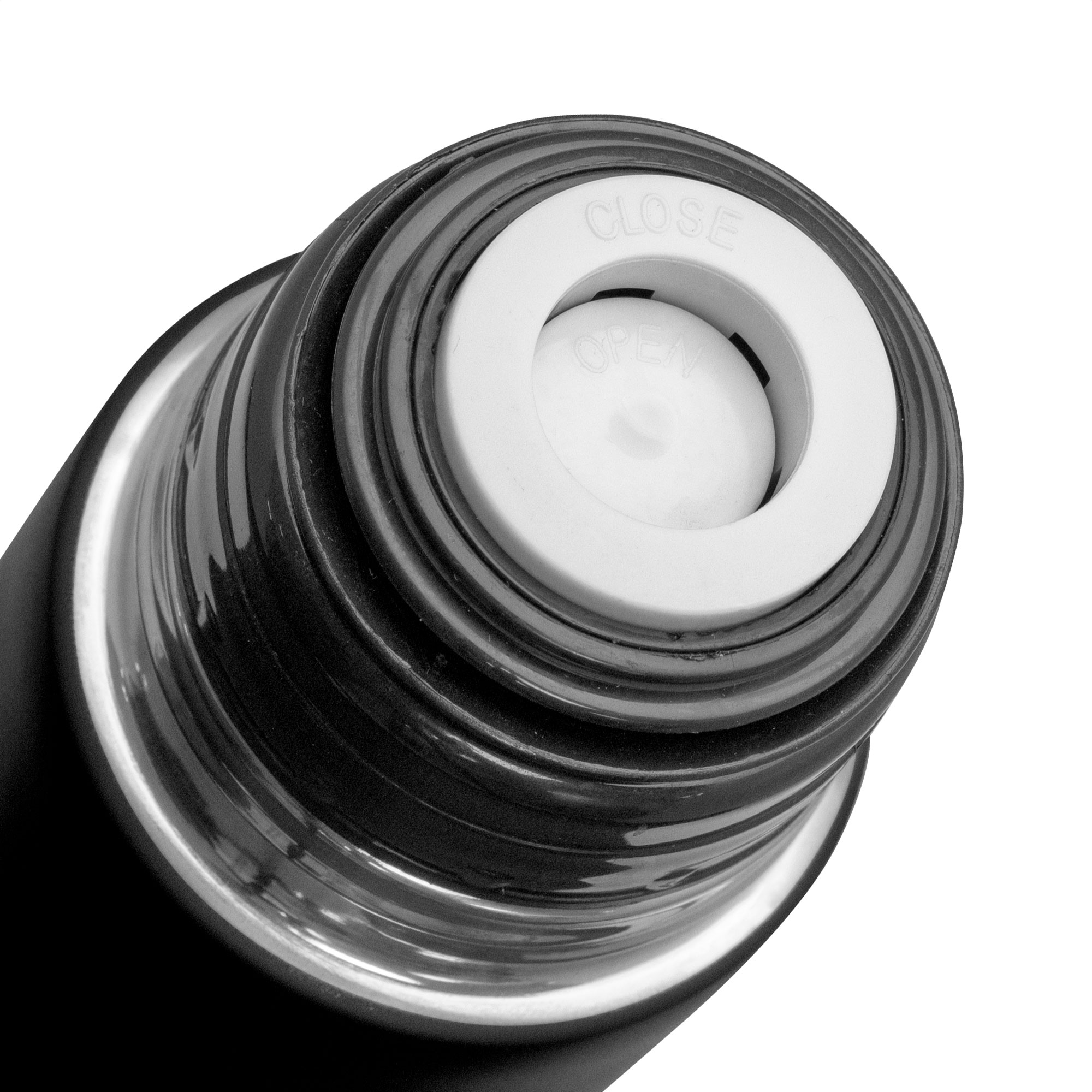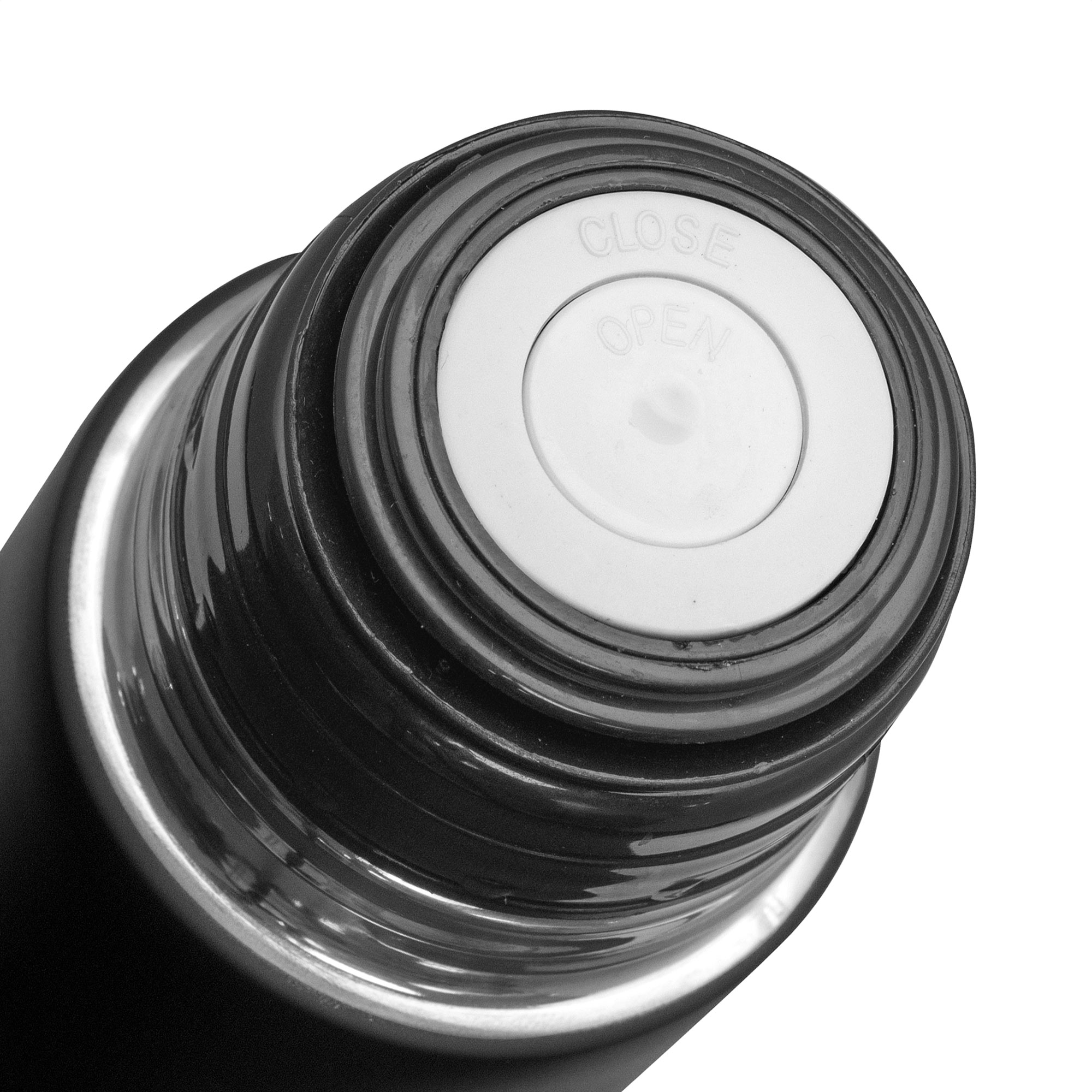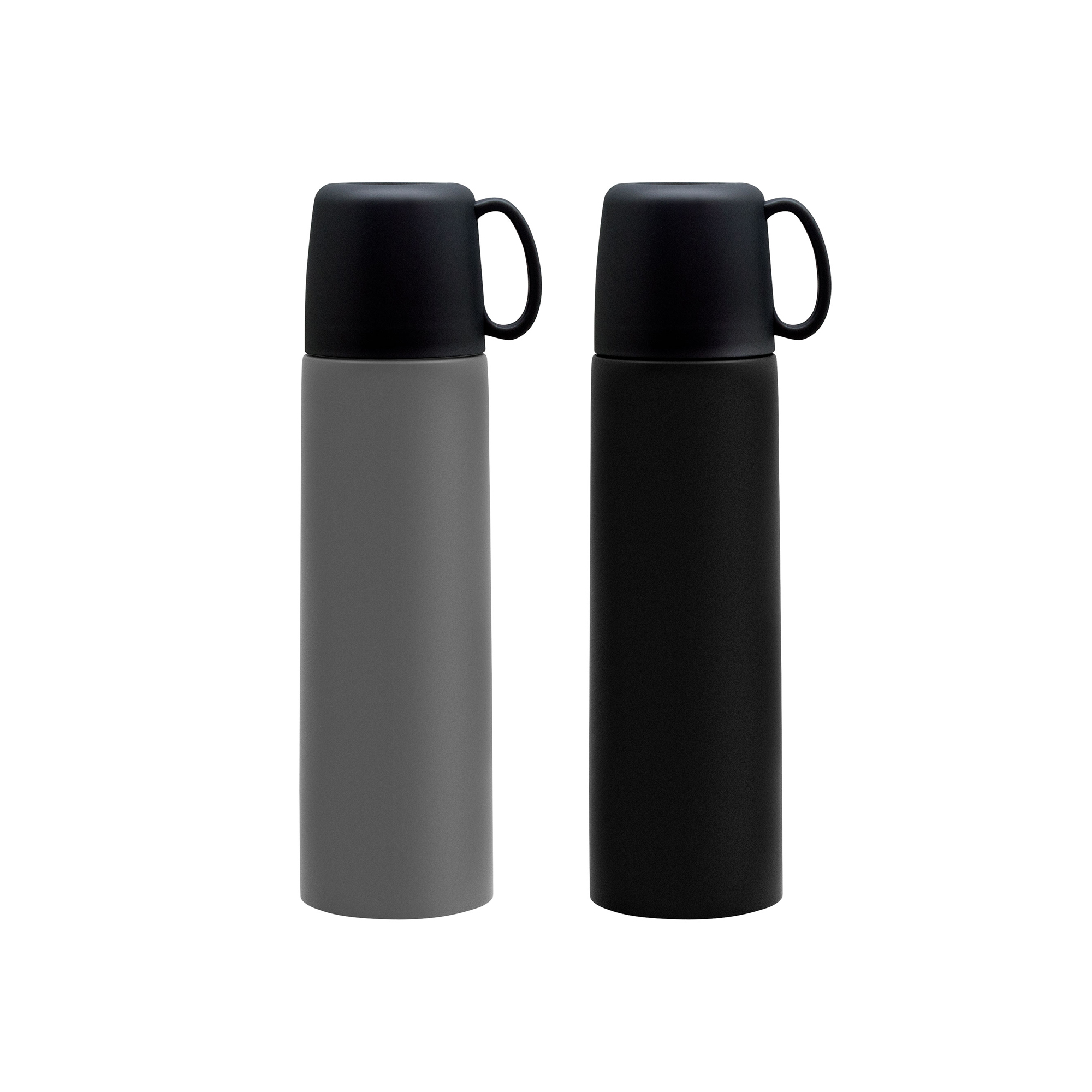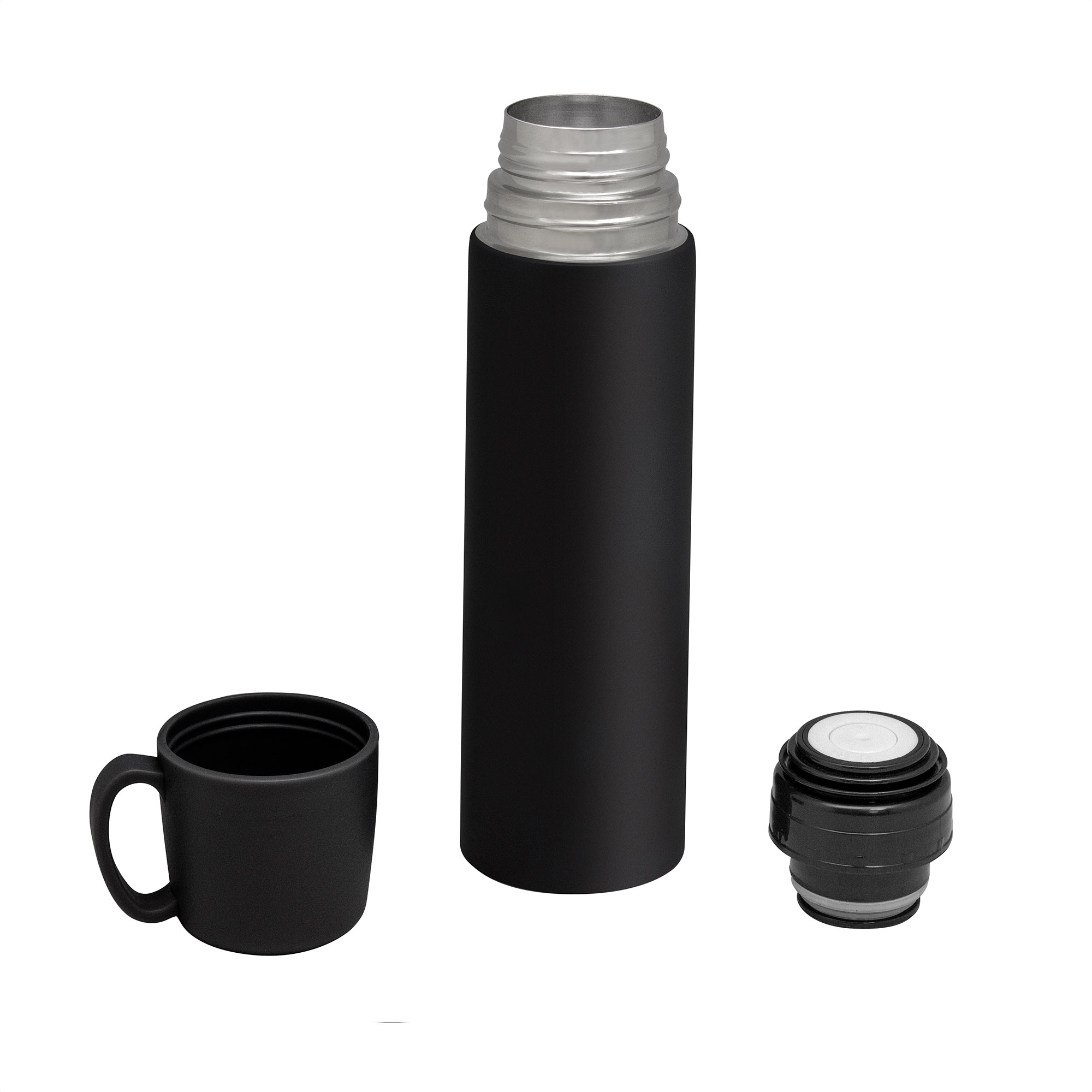 8,1 x 6,8 x 25 cm. Capacidad 500 ml. Acero inoxidable y Polipropileno. Termo con aislamiento térmico vacuum. Acero inoxidable 304 interior / 201 exterior. Tapa y taza plásticas en color negro. Pintura acabado mate. Mantiene hasta 12 hs la temperatura de las bebidas calientes y 24 hs de las bebidas frías. Presentación en caja de regalo Kraft.